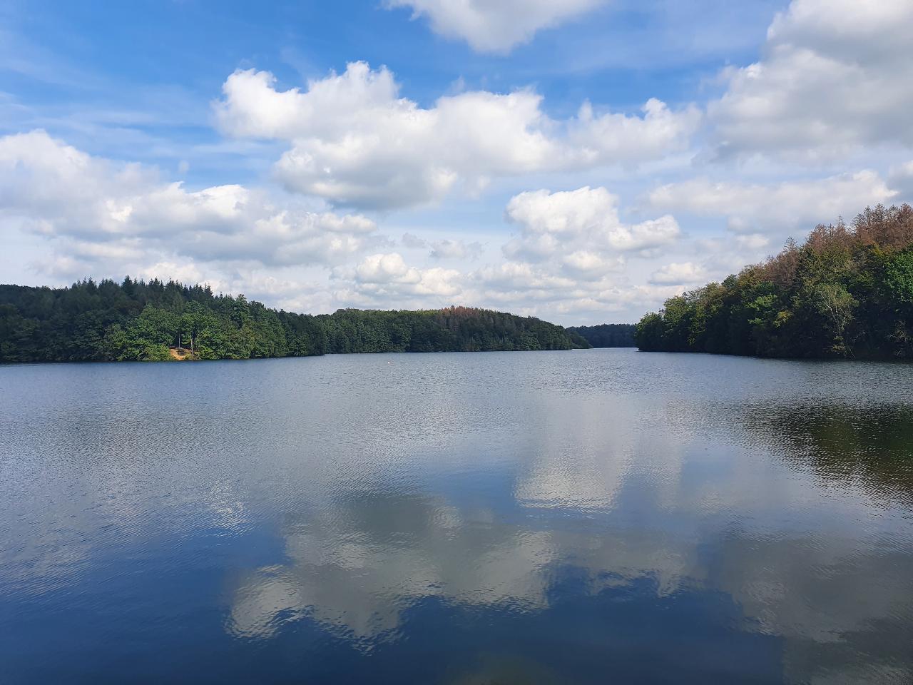 Ein paar Gehminuten weiter erwartet uns eine der Perlen des Wasserquintetts – die Neyetalsperre. Dort gibt es auch eine „heimatliche“ Überraschung, die an dieser Stelle nicht verraten werden soll… Über die beeindruckende Staumauer geht es weiter über schöne Waldwege entlang der Talsperre und durch das idyllische Tal der Neye: Bergischer geht es kaum. In Klitzhaufe queren wir den Bach und erreichen über Pfad und Waldwege wieder Großblumberg, wo uns im Gasthaus zur Neyetalsperre eine gemütliche, typisch bergische Schlusseinkehr erwartet. Dort lassen wir die gewonnenen Eindrücke zum Land des Wasserquintetts noch einmal Revue passieren. Und vielleicht singen wir ja auch noch das Bergische Heimatlied…